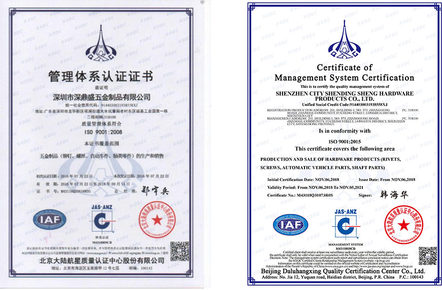 深鼎盛五金制品廠嚴格按照ISO9001體系來執行各項工作,從每個產品的設計到生產到質量檢測,鼎盛都嚴格按照該體系指示來執行,我們有獨立的QA部門,該部門有獨立的生產,設計部門,設置了標準的QA/QC程序,從原材料的采購,到生產,到組裝,包裝,以及出貨我們都進行嚴格檢測和控制以確保客戶能得到最好的產品和服務。